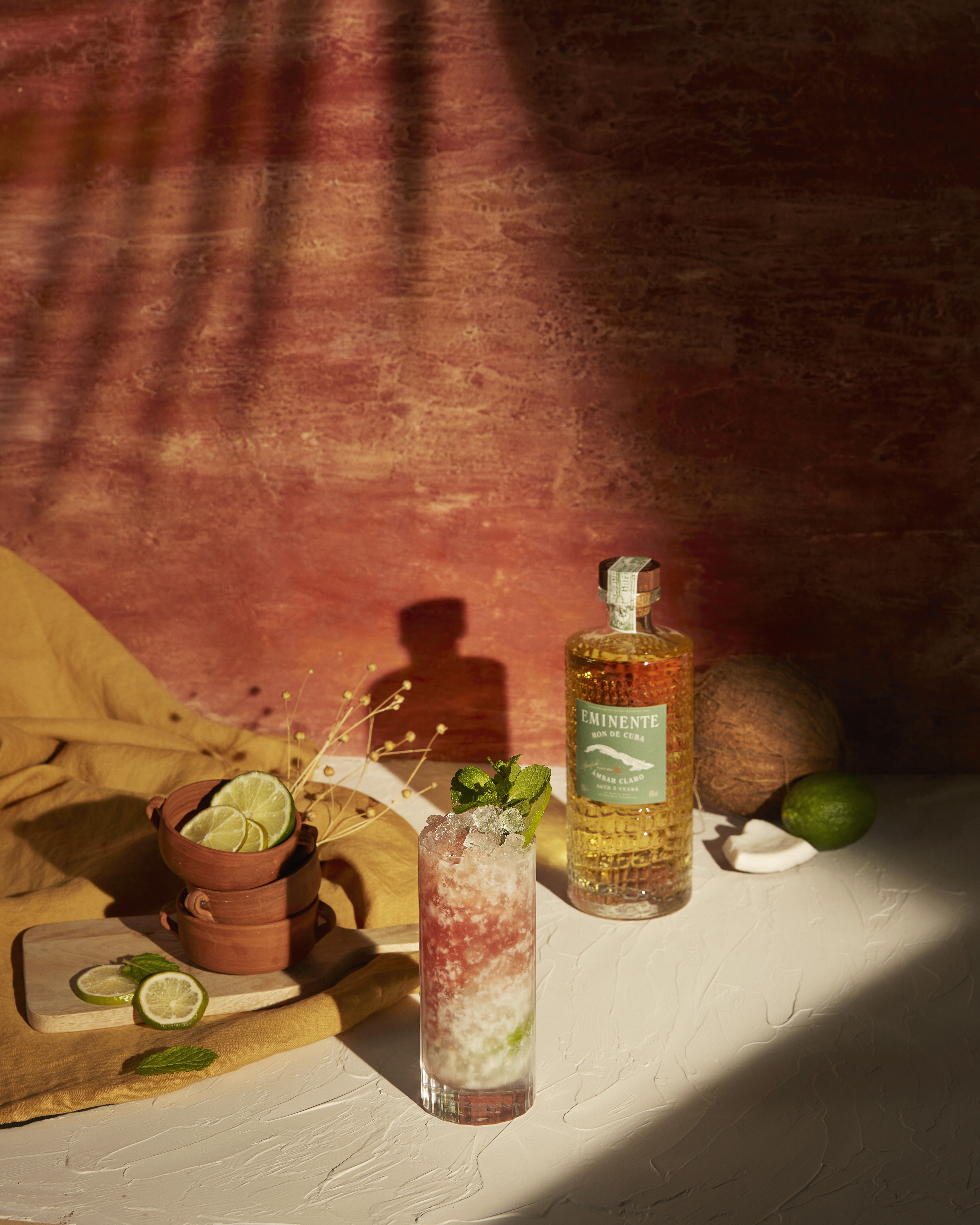 Ajoutez quelques gouttes de Bitters ou de vin de Porto. Garnissez avec quelques feuilles de menthe et une tranche de citron vert.